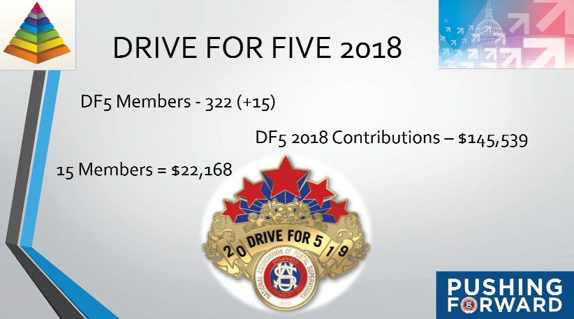 Whether it is the Southeast Area leading all the areas or Maine leading all states in per-capita contributions, collectively, we are making NAPS SPAC great; I thank you for it. I am most proud of our effort in 2018 to grow our “Drive for 5” contributors. In 2018, the number of members who give through payroll and OPM deductions increased by 15. Those 15 members generated over $22,000 in SPAC funds. This is an average of $1,478 per new “Drive for 5” member.